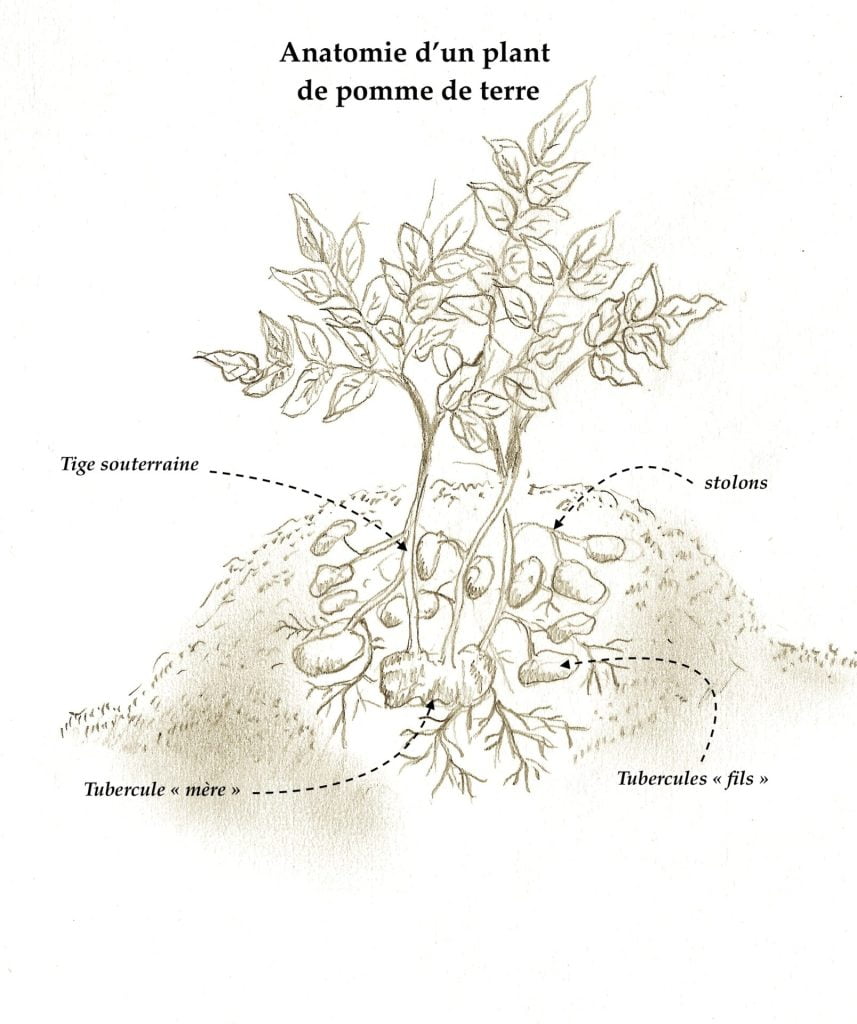 Vous êtes vous déjà demandé où et comment se formaient les tubercules des pommes de terre ? J’ai longtemps cru qu’ils provenaient de la patate que l’on mettait en terre. Que cet organe de réserve alimentait des tubercules émis par ses racines. Du coup il me suffisait de déposer les patates sur le sol, de les couvrir avec de la paille, de la tonte ou n’importe quel matériau occultant la lumière. Et puis j’ai découvert que ce n’est pas comme cela que fonctionne la pomme de terre !