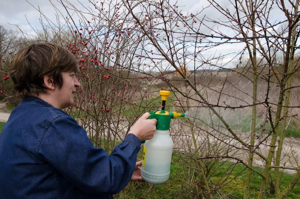 Pas facile le traitement contre la cloque du pêcher :non seulement il faut repérer précisément le bon moment (le stade « pointe verte ») mais soigneusement viser TOUS les bourgeons de l’arbre.